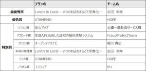 この度は「Lunch to Local」をご評価いただき、最優秀賞をいただきましたことを大変光栄に思います。審査員の皆さまをはじめ、本取り組みにご協力いただいた地域のお弁当事業者の皆さまに心より感謝申し上げます。